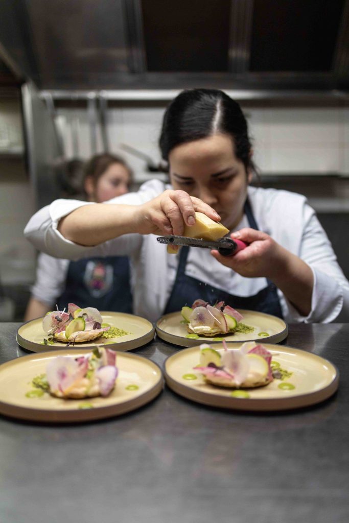 Nous sommes une équipe de 5 personnes et comme beaucoup d’entrepreneurs, en plus de réaliser la fonction de cheffe de cuisine (élaboration des menus, recettes, gestion du service), nous nous occupons de toute la partie administrative et managériale que comprend la gestion d’un restaurant.