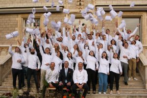 Avant la cérémonie officielle de remise des diplômes, le rendez-vous a été donné sur le campus d’Écully, au Château du Vivier, qui a accueilli nos anciens étudiants tout au long de leur scolarité. L’occasion pour ces nouveaux diplômés de se retrouver autour d’un copieux petit déjeuner, de s’occuper des dernières formalités administratives, mais surtout d’immortaliser leur passage à l’Institut Paul Bocuse avec la traditionnelle photo de promotion. Une photo de classe mythique, entre diplômé et surtout entre amis, accompagnés de leur parrain de promotion et de la Direction de l’école, dont Dominique Giraudier, le Maître d’école, et Gilles Pélisson, Président de l’Institut Paul Bocuse.
